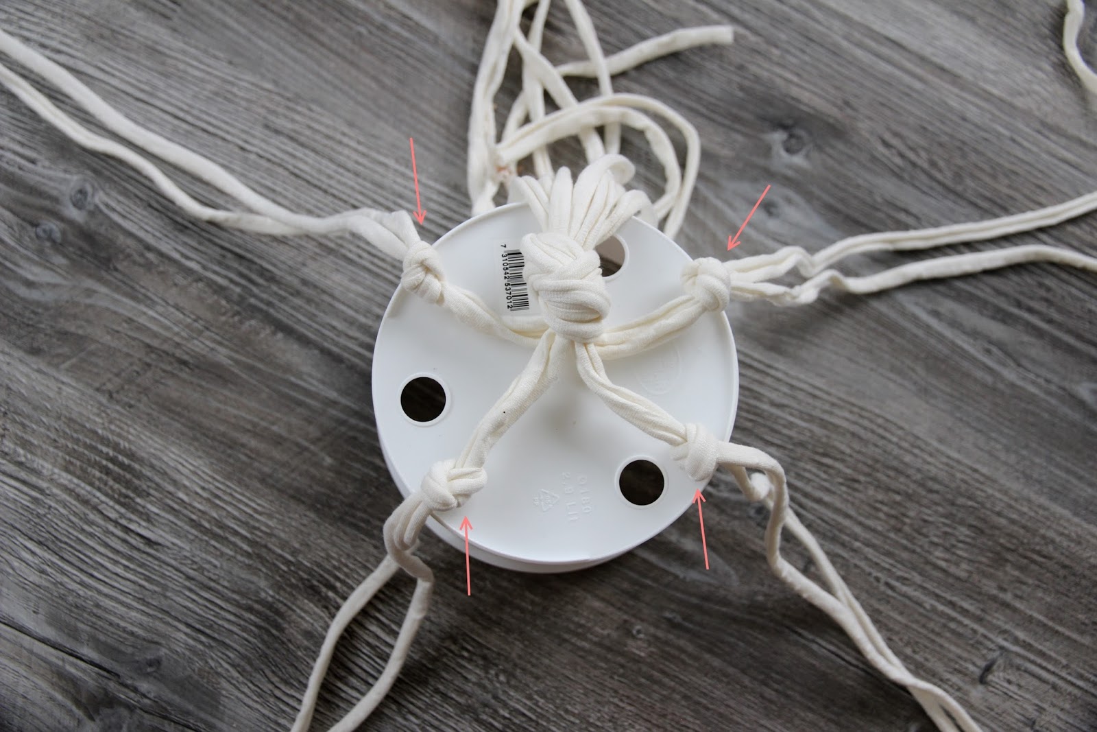 4. Ota vierekkäisistä solmuista aina yhdet kuteet ja solmi toisiinsa noin ruukun puoleen väliin. (Mikäli ruukku on iso tai naru ohut solmi noin 1/3 pituuteen ruukkua ja toista toinen kerros 2/3 pituuteen)